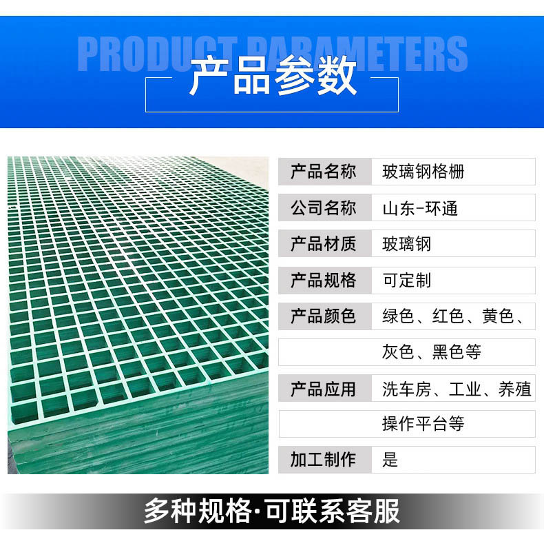 山東環通復合材料有限公司是從事玻璃鋼格柵的生產廠家,公司位于山東濰坊安丘市,玻璃鋼格柵主要分為25*25,38*38,42*42.顏色分為:綠色,紅色,灰色,黃色,藍色等。公司生產玻璃鋼產品為:公司生產玻璃鋼產品為:玻璃鋼儲罐,玻璃鋼管道,玻璃鋼夾砂管,玻璃鋼防腐,玻璃鋼冷卻塔,玻璃鋼化糞池,玻璃鋼保溫罩等。